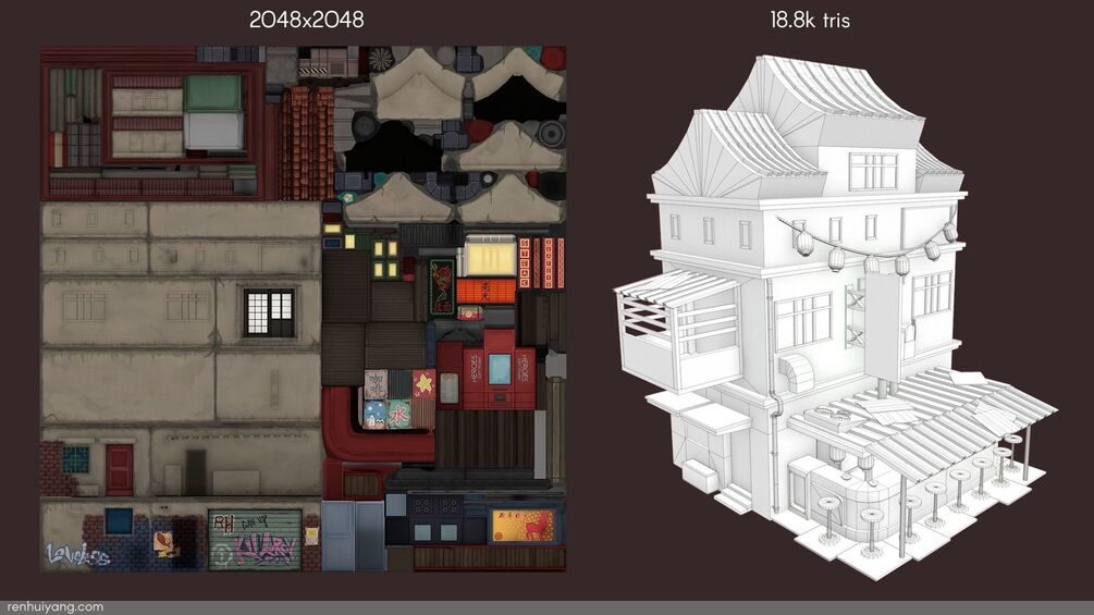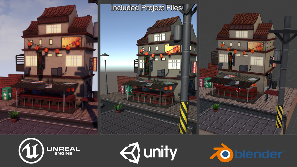 This is a 3D model of a stylized noodle restaurant and outdoor diorama assets.